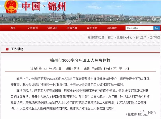 锦州市应用HRA为3000名环卫工人进行疾病早期筛查