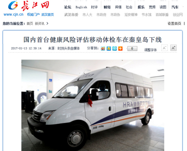 2017年伊始,国内首台HRA健康风险评估快速体检车在秦皇岛下线,受到广大媒体的关注。人民网、中国网、中新网、凤凰资讯、长城网、新华北网、华龙网(重庆新闻网)、东方头条等上百家媒体对此进行了报道。查看详细>> -